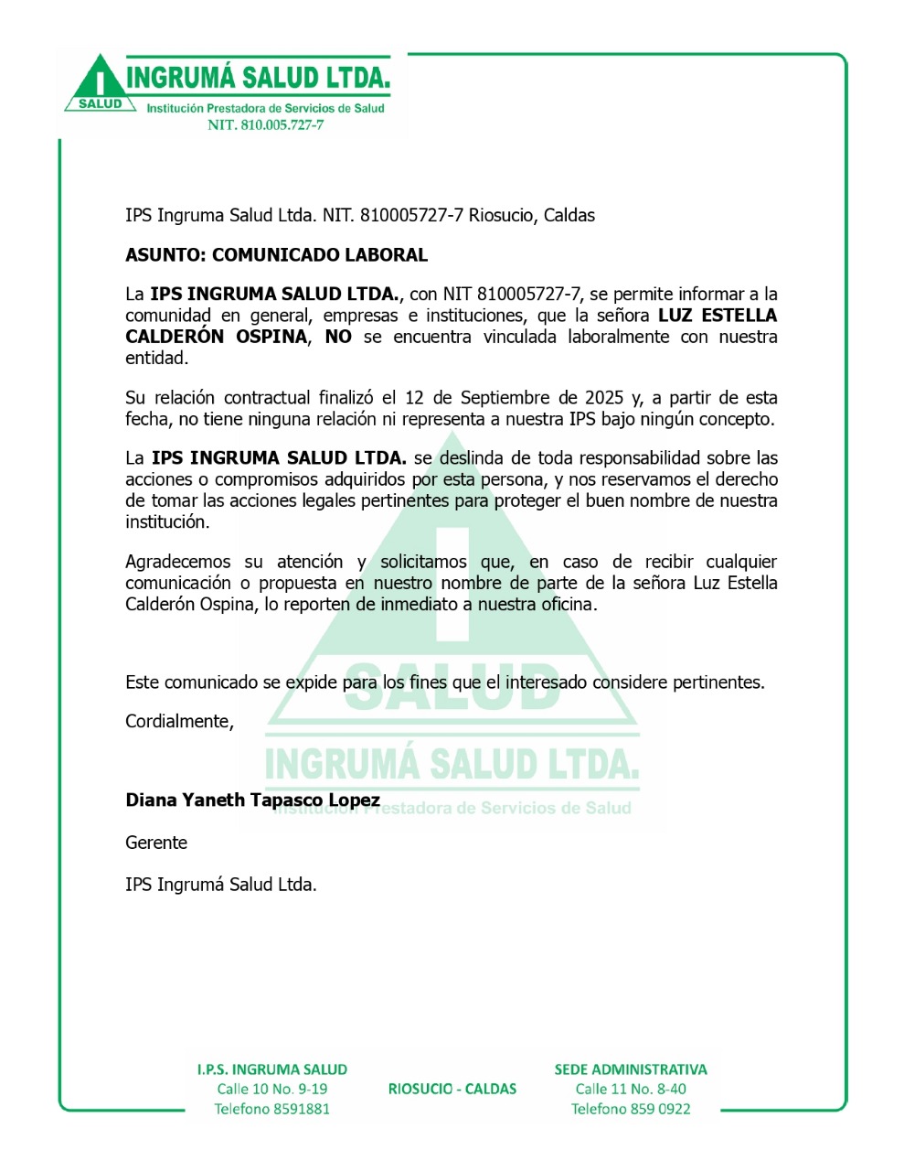Calle 10 # 9-19 Primer Piso Riosucio caldas